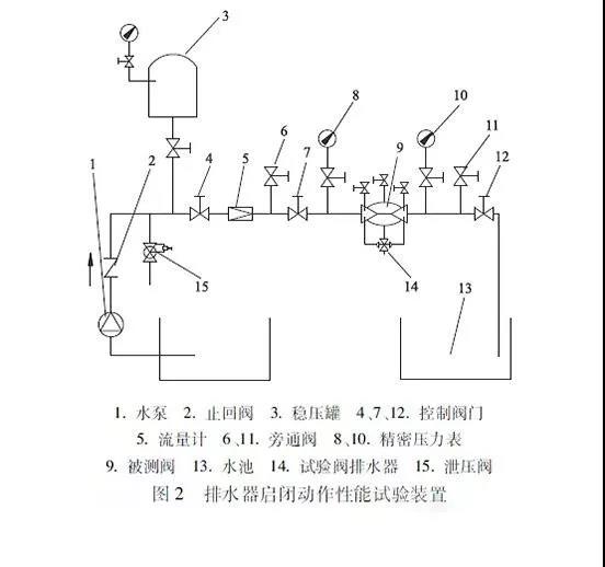 排水器啟閉動作性能試驗裝置(圖2)壓力小于0 3 MPa。被測閥的進口壓力降低,在不大于出口壓力時,排水器應開啟排水,但不持續(xù)排水。在被測閥通水時,排水器應迅速關閉,不漏水。連續(xù)重復上述步驟3次以上,排水器啟閉動作應靈敏可靠。